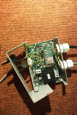 Ich habe dann Präzisions-Lichtschranke und Netzteil in einem kleinen Gehäuse untergebracht. Im Gehäuse sind ausserdem verkabelt: Der Netzanschluss für das Netzteil, der Anschluss des Magnetventils mit dem Relais und ein 4-adriges Telefonkabel als Ausgang zur "Messsonde".