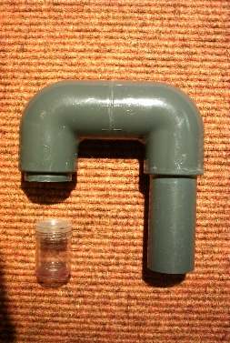 An der anderen Seite wird ebenfalls ein Stück PVC-Rohr eingeklebt, dieses aber deutlich kürzer. Die Länge dieses Rohrstückes richtet sich nach der Größe des Dauertestbehälters, den ihr auftreiben könnt. Ich habe ein Verkaufsfläschchen für Kontaktlinsen aus transparentem Kunststoff bekommen, welches perfekt als Dauertestbehälter geeignet ist.