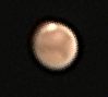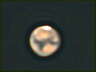 Der Mars kommt immer näher :-) und so habe ich um etwa 0 Uhr 30 einige hundert Bilder mit einer Canon Videocamera aufgenommen und mit Registax die besseren addiert. Das Seeing war naturgemäss recht schlecht -visuell vielleicht alle 5 bis 10 Sekunden einmal kurz ein halbwegs klares Bild bei etwa 200 facher Vergrößerung, vor der Videokamera saß ein 20 mm Plössel Okular und die Videokamera auf 20 fach Zoom sowie fixer Belichtung auf 1/250 tel Sekunden. Im kleinen Bild ist etwa der visuelle Eindruck (allerdings in Wiklichkeit viel heller und nur zeitweise) dargestellt: